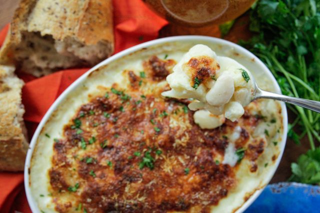 With all the goodness of a creamy mac ‘n cheese, our Cauliflower Lima Bean Au Gratin brings together cauliflower, buttery large lima beans, and a heavenly bechamel sauce made with butter, flour, milk, seasonings, sharp cheddar and freshly grated Parmesan. Topped with bread crumbs, and baked till bubbly and brown, this cheesy dish will complement ham, roasts or turkey. And it will be gobbled up by adults and kids alike.