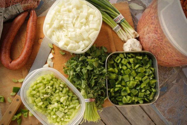 The night before, in addition to soaking the red beans, dice the vegetables, mince the garlic and slice the Andouille sausage. To make the cooking process easier, store everything in containers so they’re ready to go.