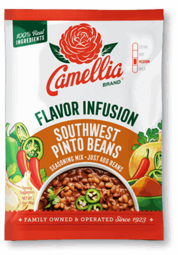 Our Southwest Pinto Beans Flavor Infusion blends bold chili flavor, warm cumin, and vibrant vegetables for a flavor-packed pot of beans. Whether you’re an experienced cook or a novice in the kitchen, you can serve up bright, satisfying Southwest flavor with ease.