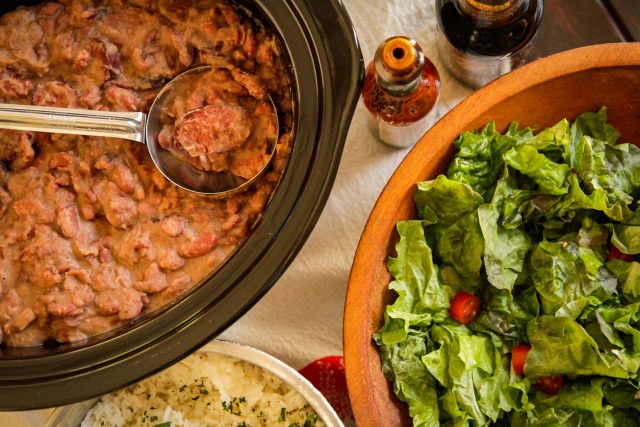 “Soak and rinse them. Put them in the crockpot with some onions, garlic, celery, boiled pickled meat, kitchen bouquet, and brown gravy powder.”